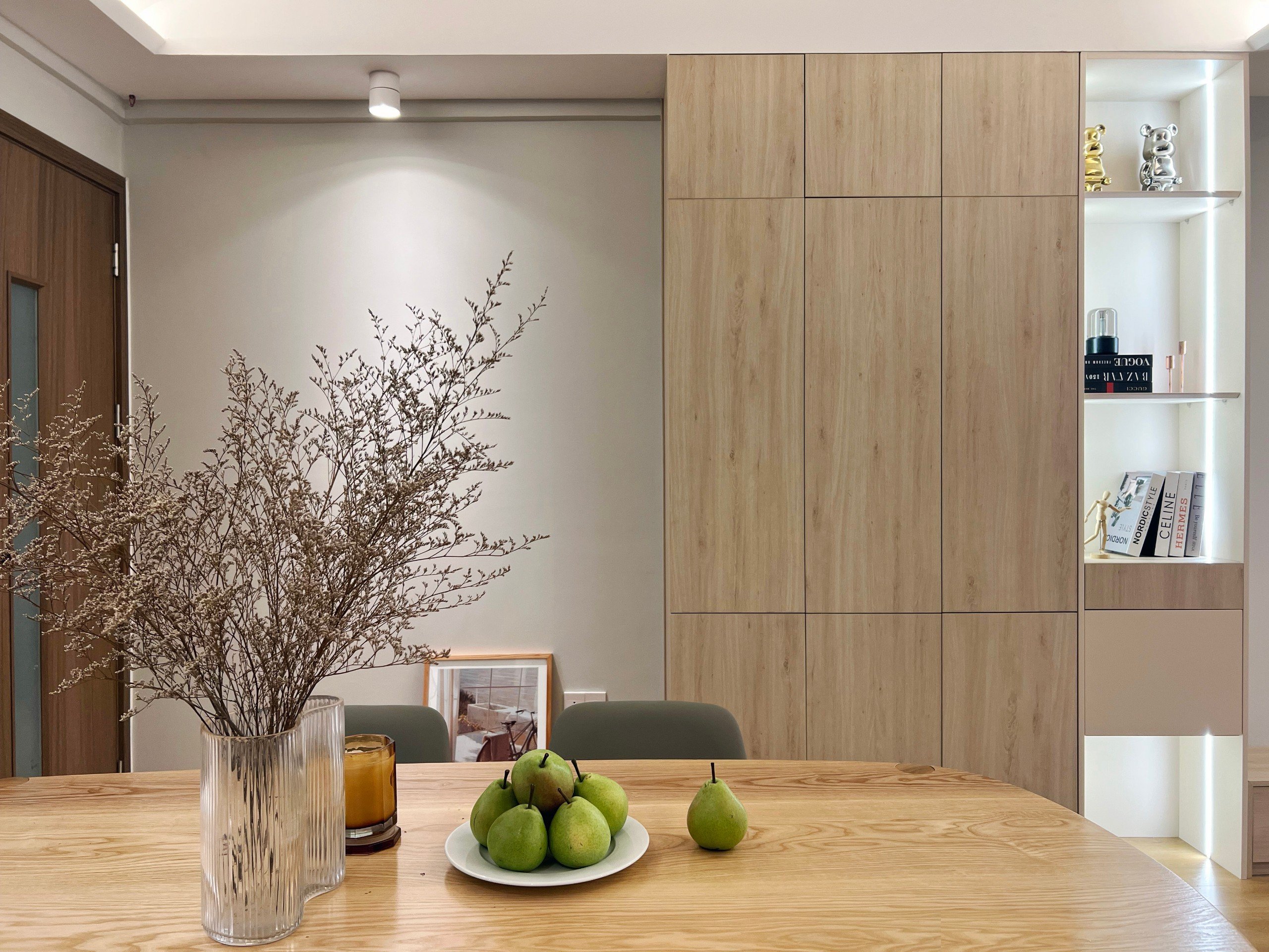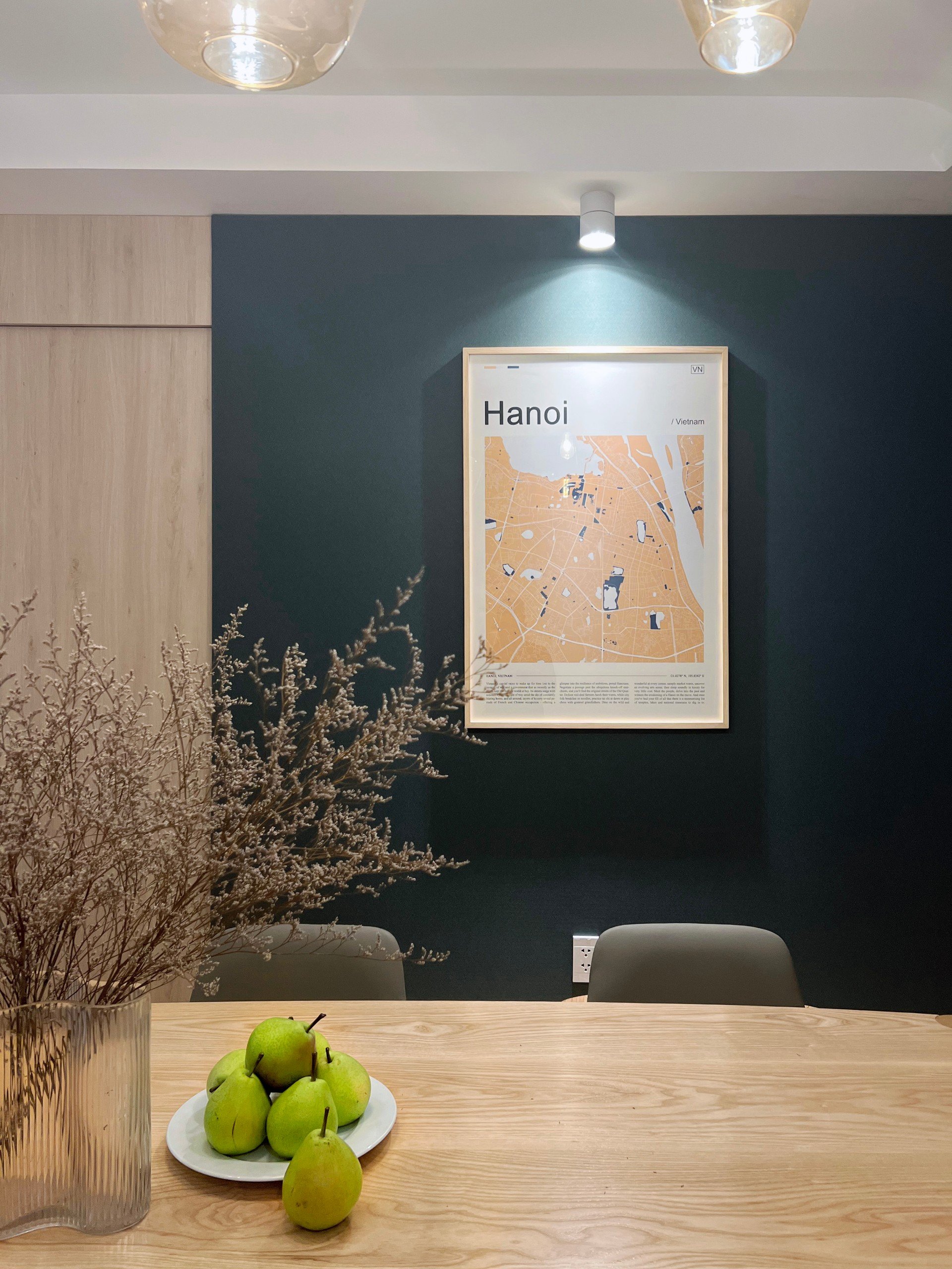 Bàn ăn gỗ nhỏ gọn, ánh sáng tập trung